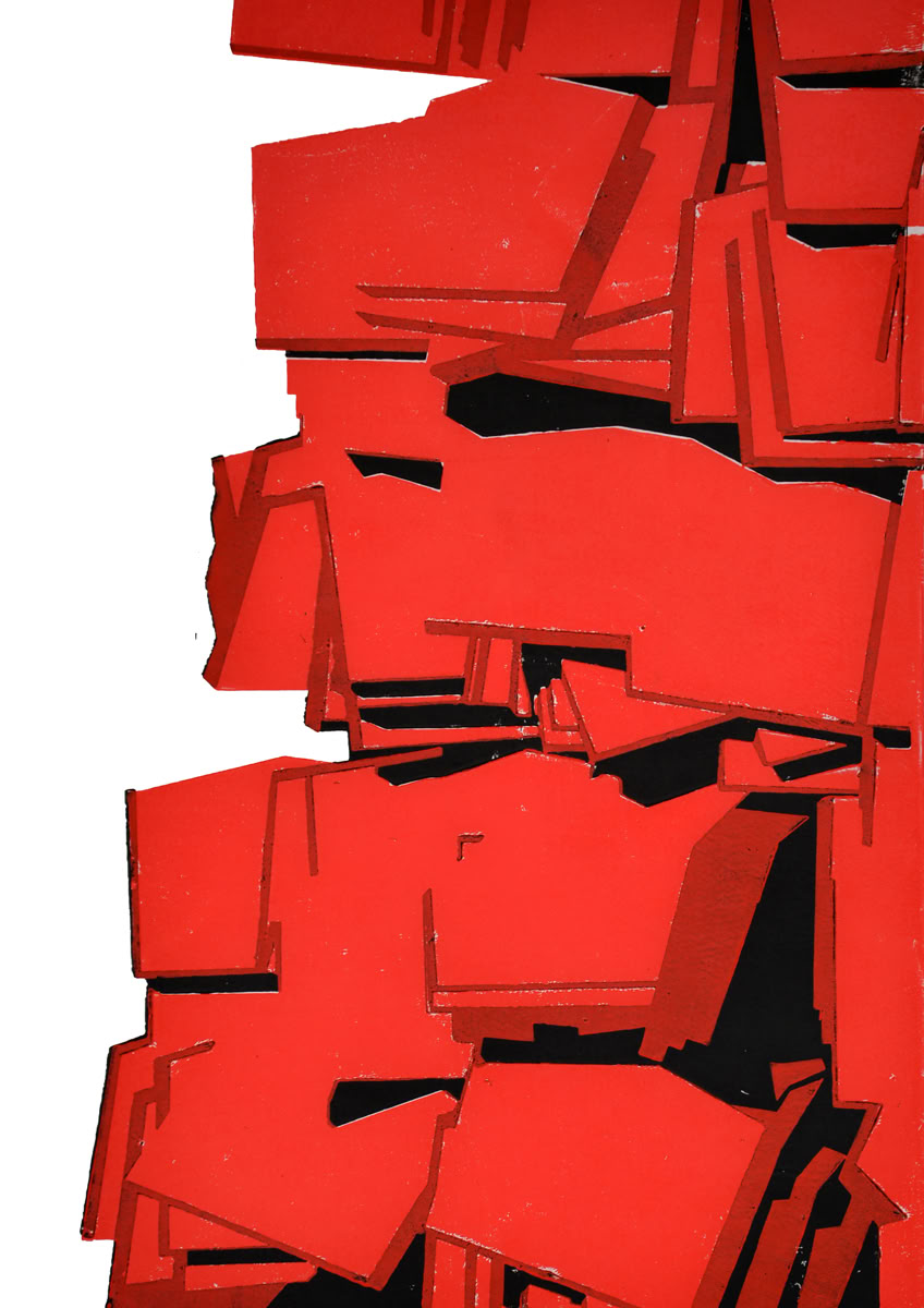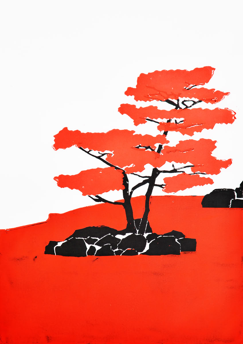 Linolschnitt / Dreifarbiger Handabzug auf Fliesen